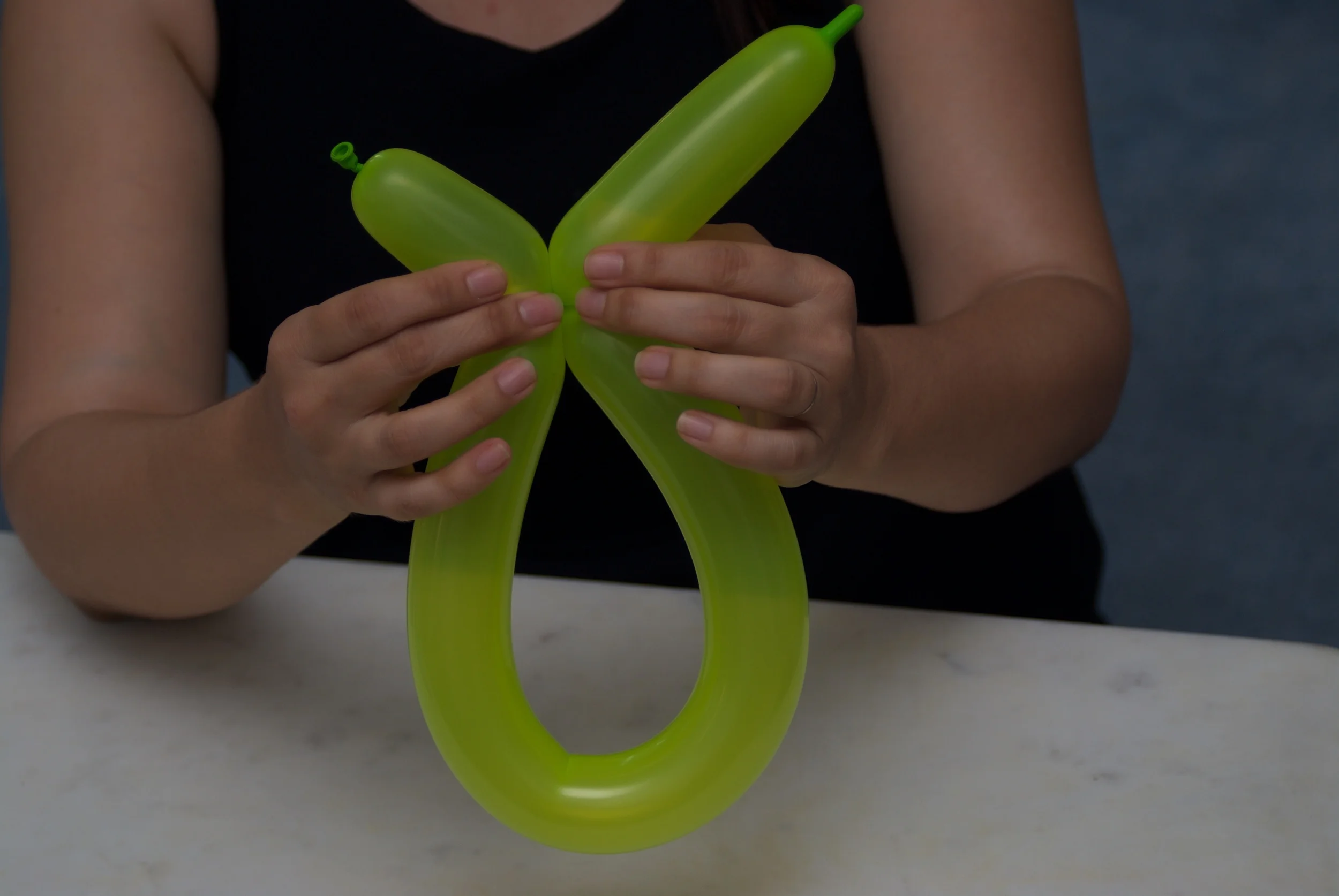 2. Cross the ends of the balloon (with the non-tied end being about three inches longer than the knotted end.)